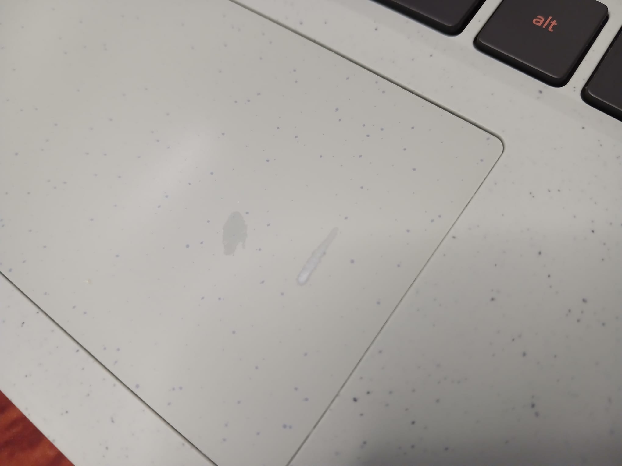 Please take a look at the photos, there are some spots on the palm rest area. besides that in very nice condition! Perfect working condition!